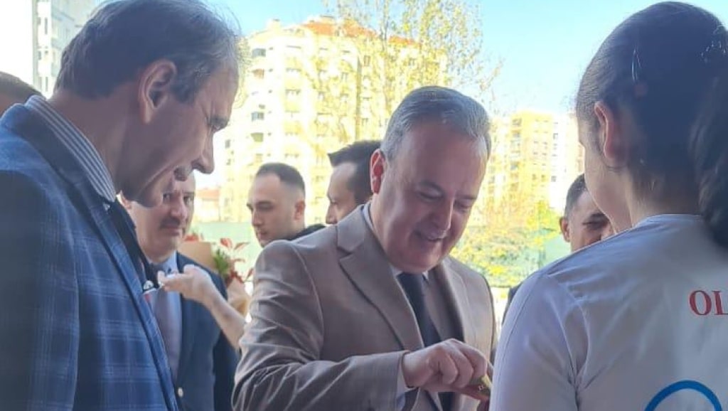 Okul girişinde okulumuz MATEMATİK OLİMPİYAT TAKIMI öğrencileri tarafından çiçekle karşılanan İlçe Kaymakamımız;